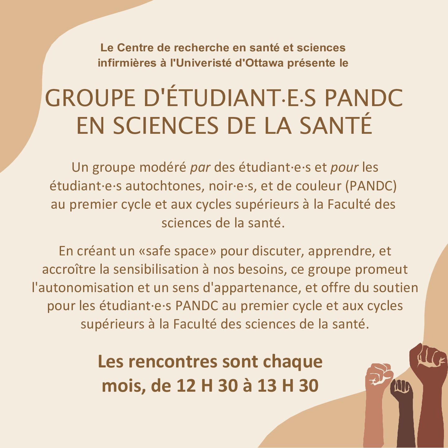 Please join us for our next PANDC (Personnes Autochtones, Noires et de Couleur) meeting on Monday, March 16th at 12:30 pm. This discussion group aims to foster empowerment, a sense of belonging, and support for PANDC students within the Faculty of Health Sciences.